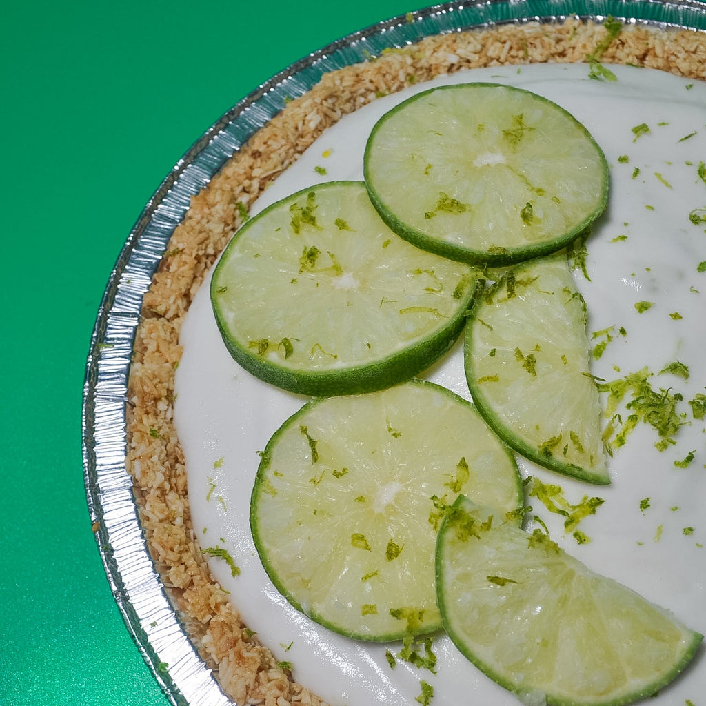 Vegan Fresh Lime Pie (GF/SF): Original recipe coconut lime vegan ice cream made with freshly squeezed limes, on a gluten-free coconut crust sweetened with maple syrup, topped with slices of limes and lime zest.